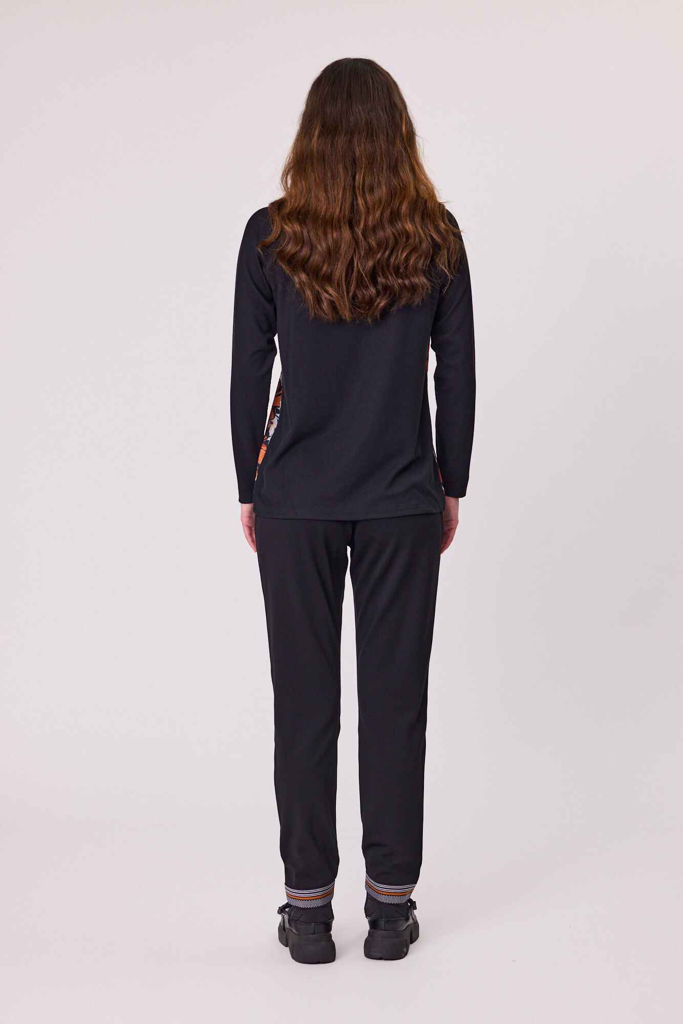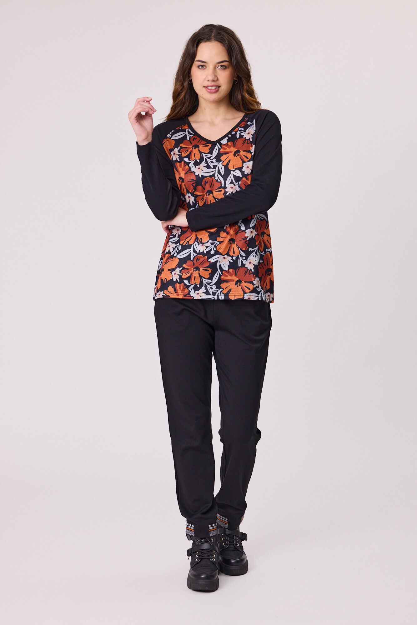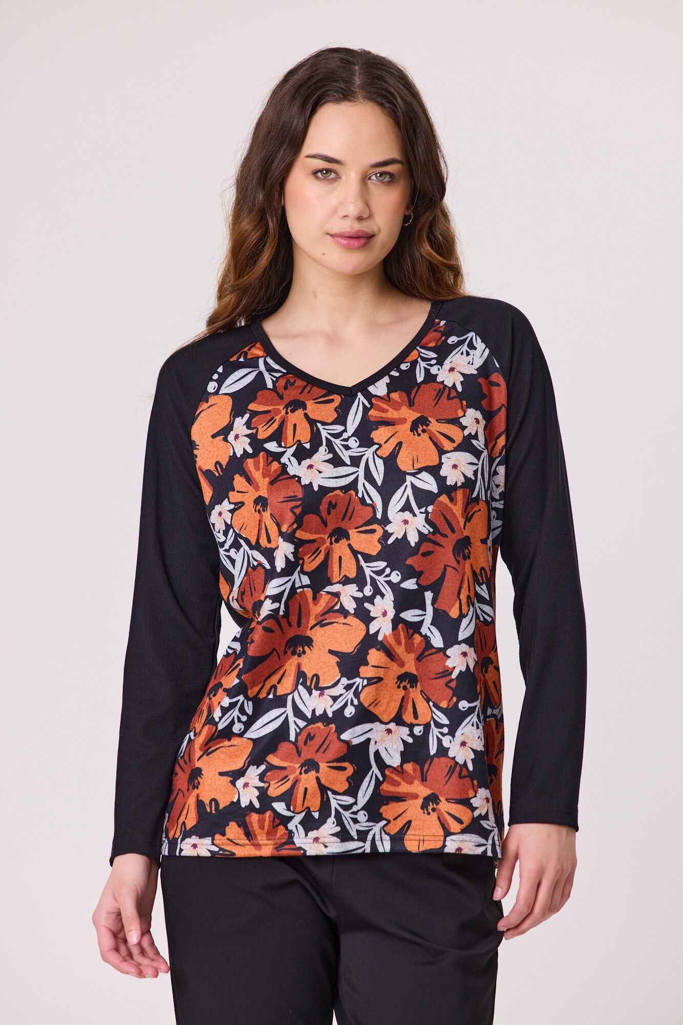 A modern V-neck knit top featuring a printed front for added interest, balanced with plain sleeves and back for a clean finish. Comfortable and easy to style, it’s perfect for everyday wear with a touch of detail.