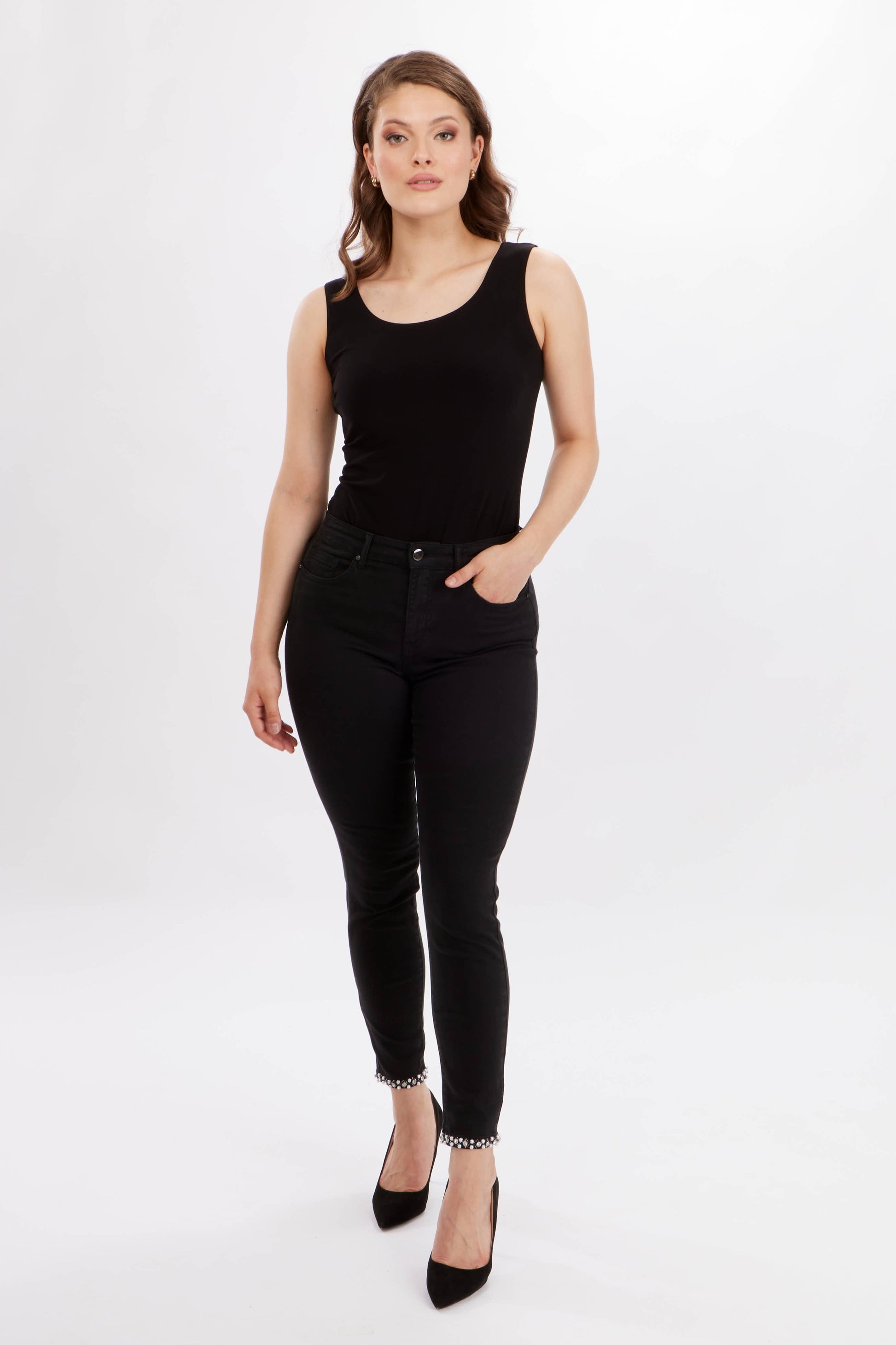 These are no ordinary jeans from Frank Lyman—they feature embellishments all along the cropped ankle, a feature that adds a sterling touch. If you're looking for a pair of jeans that step you out of your comfort zone, this slim leg, high-rise pair might be the ones.