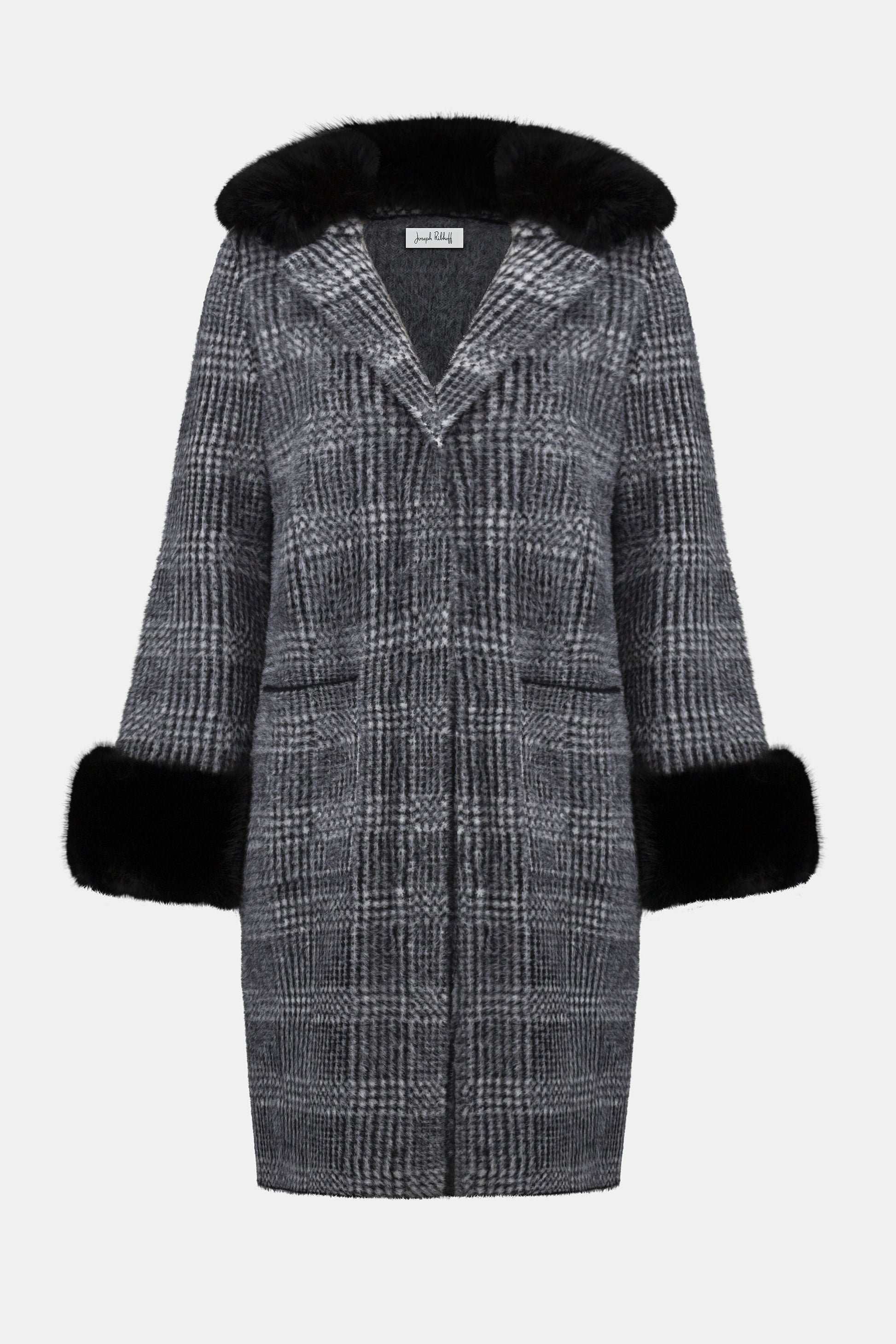 Introducing the Joseph Ribkoff long blazer coat, a tailored fit masterpiece designed for formal, evening, and business occasions. Featuring an open-front button closure, this chic and elegant coat boasts a notched neckline and removeable fur trim. The plaid pattern and long sleeves add a sophisticated touch, making it a perfect addition to any stylish wardrobe.
